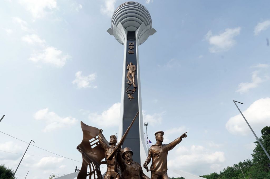 성남시 중원구 여수동 시청 공원으로 이전·건립한 현충탑(정면 육해공 호국영령 조각상). 성남시 제공