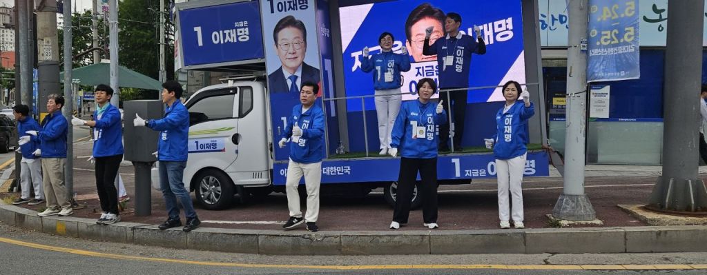 조인철 더불어민주당 의원(광주 서구갑)이 23일 오전 광주 서구 화정사거리에서 이재명 대선 후보 지지를 호소하는 집중 유세를 벌이고 있다. 조 의원과 선거운동원들은 파란색 선거 운동복을 입고 차량 유세단과 함께 손을 흔들며 출근길 시민들에게 인사했다. 신동호 기자