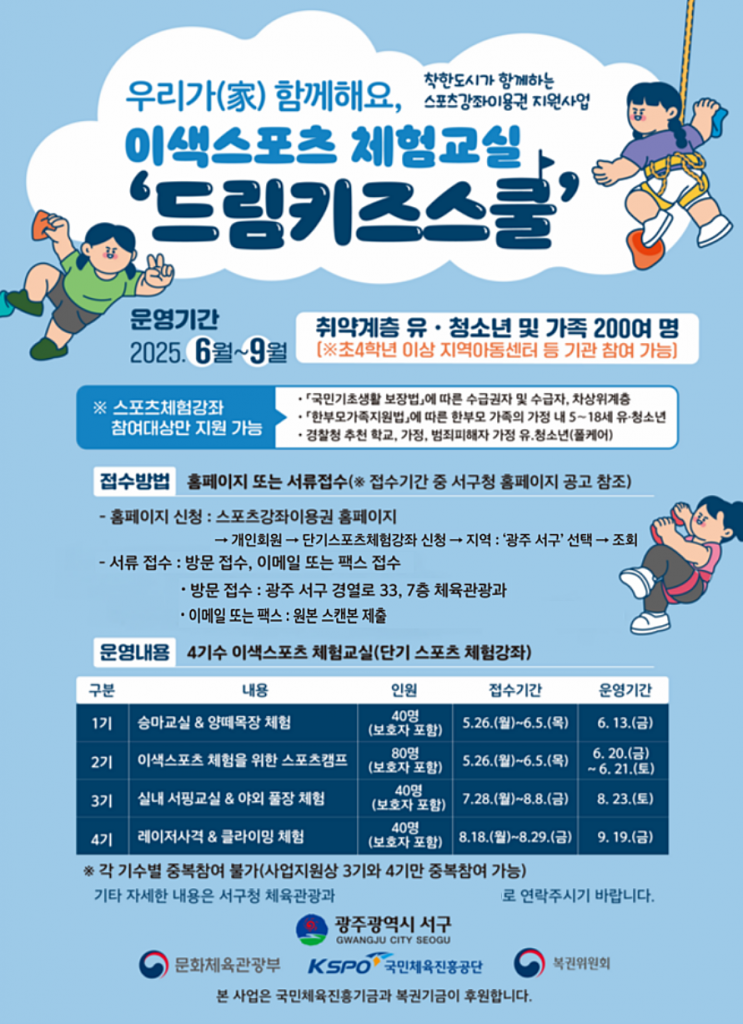 광주시 서구(구청장 김이강)가 복지 사각지대의 유·청소년을 위한 단기 스포츠 체험 강좌 '드림키즈스쿨'을 새롭게 선보인다.