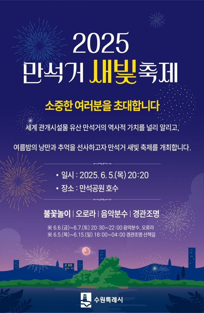 수원시는 만석거 새빛축제에 이어 ▲수원 국가유산 야행(夜行)(6월 13~15일), ▲수원화성문화제(9월 27일~10월 4일) ▲수원화성 미디어아트(9월 27일~10월 12일) ▲화성행궁 야간 개장(5월 3일~11월 2일) 등 밤에 즐길 수 있는 다채로운 축제를 개최한다.