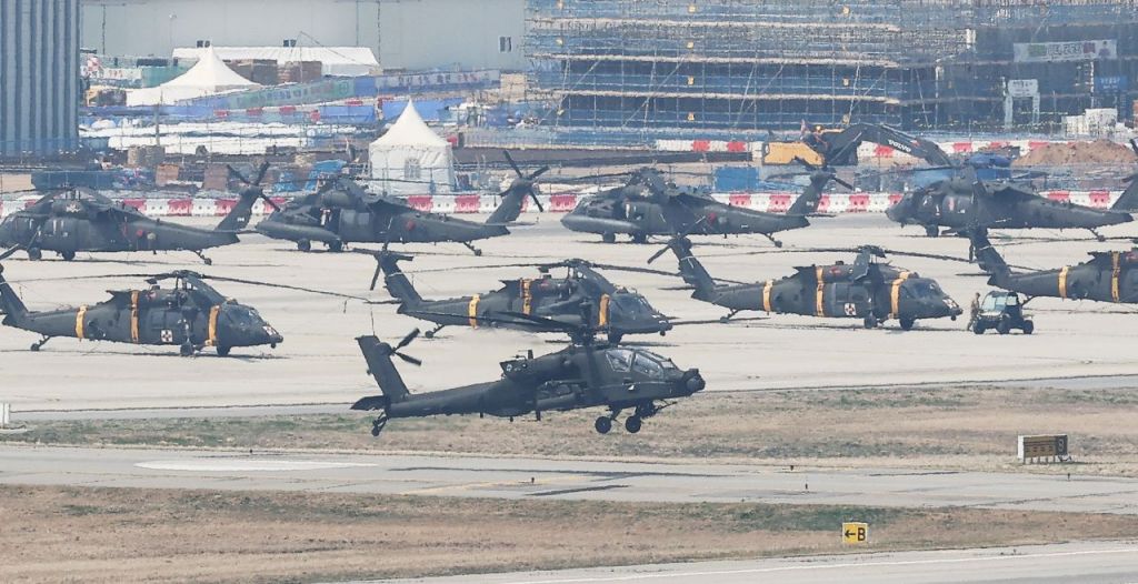 지난달 10일 경기도 평택시 캠프 험프리스에서 아파치 헬기가 이동하고 있다. 연합뉴스