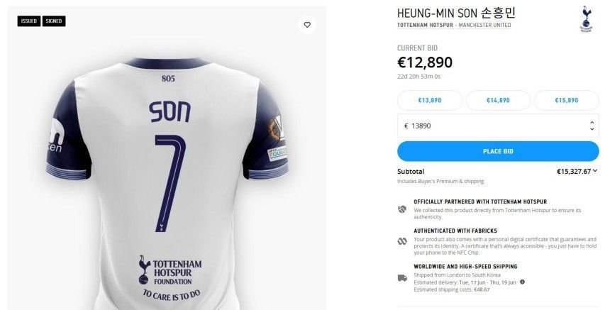 토트넘 주장인 손흥민의 유니폼은 시작부터 엄청난 가격이 붙었다. 입찰가는 경매가 시작된 지 12시간 만에 1만2890유로(약 2010만원)를 돌파하며 토트넘 선수단 중 최고가를 기록하고 있다. 현재까지 총 31회의 입찰이 이루어졌으며 최고 입찰자는 호주 국적의 구매자로 알려졌다.