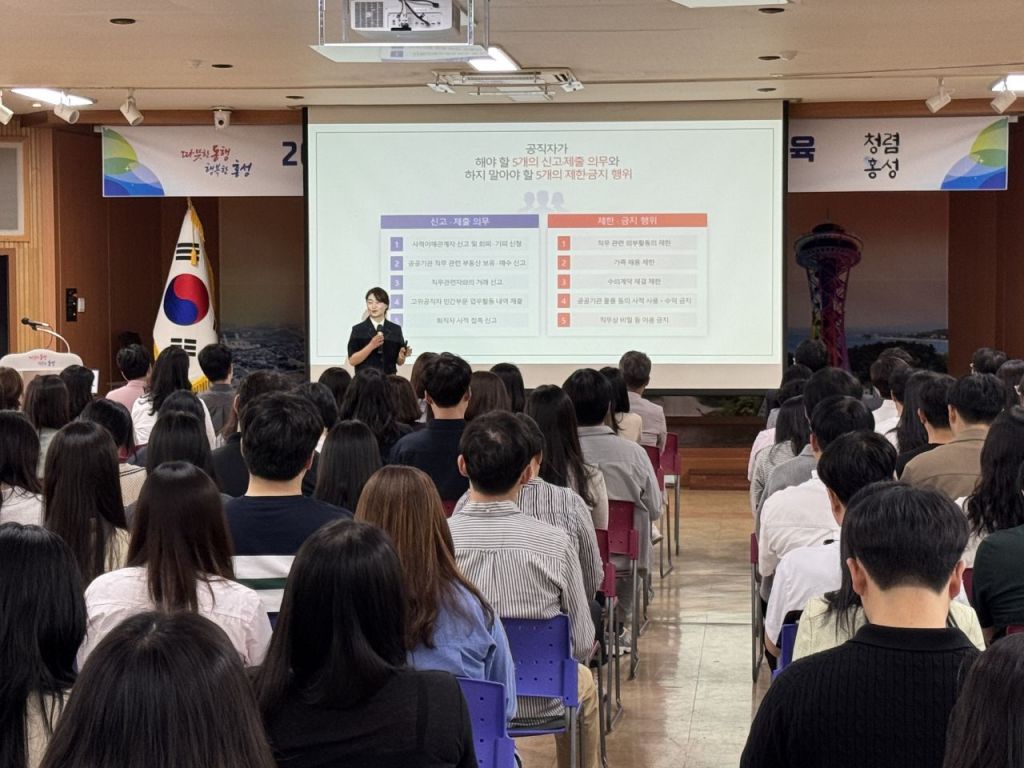 충남 홍성군은 23일 군청 대강당에서 고위공직자 및 승진자·신규 임용자 등 직원 150여 명을 대상으로 '반부패·청렴교육'을 실시했다고 밝혔다.