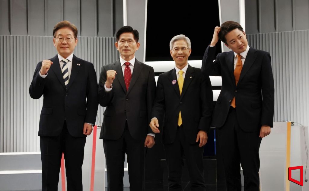 23일 서울 영등포구 KBS본관 스튜디오에서 열린 중앙선거방송토론위원회 주관 제21대 대통령선거 2차 후보자토론회에 앞서 후보들이 기념촬영을 하고 있다. 왼쪽부터 이재명 더불어민주당, 김문수 국민의힘, 이준석 개혁신당, 권영국 민주노동당 대선 후보. 2025.5.23 국회사진기자단