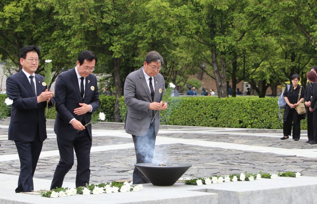 홍태용 경남 김해시장(가장 오른쪽)이 노무현 전 대통령 서거 16주기 추도식에 참석해 묘역을 참배하고 있다. 이세령 기자