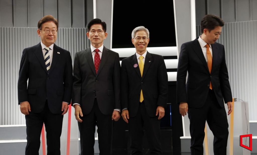 23일 서울 영등포구 KBS본관 스튜디오에서 열린 중앙선거방송토론위원회 주관 제21대 대통령선거 2차 후보자토론회에 앞서 후보들이 기념촬영을 하고 있다. 왼쪽부터 이재명 더불어민주당, 김문수 국민의힘, 이준석 개혁신당, 권영국 민주노동당 대선 후보. 국회사진기자단