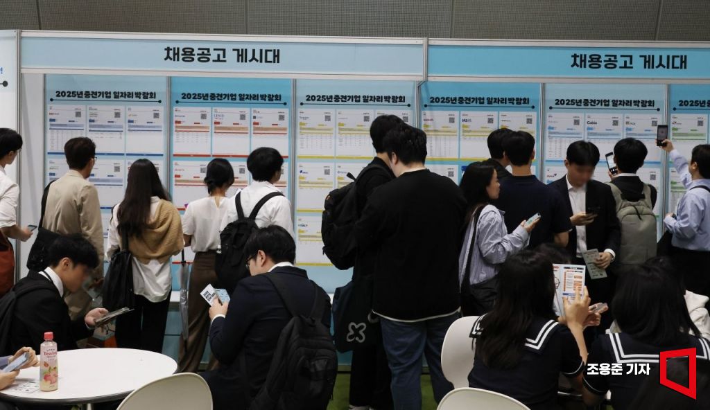 지난달 서울 강남구 코엑스에서 열린 2025년 중견기업 일자리 박람회를 찾은 구직자들이 채용공고 게시판을 살펴보는 모습