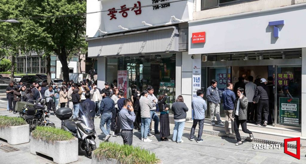 28일 서울 중구 한 SK텔레콤 공식 인증 대리점을 찾은 고객들이 유심을 교체하기 위해 기다리고 있다. SK텔레콤은 오늘부터 가입자들에게 유심 무료 교체서비스를 제공할 예정이다. 2025.4.28. 강진형 기자