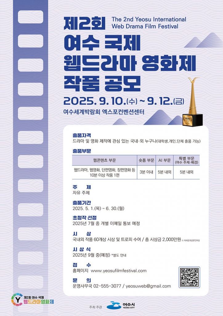 시 관계자는 "여수 국제 웹드라마 영화제는 창작의 자유, 기술의 융합, 여수의 낭만이 어우러지는 무대가 될 것이다"며 "새로운 이야기와 상상력을 지닌 창작자들의 많은 관심과 참여를 바란다"고 말했다.