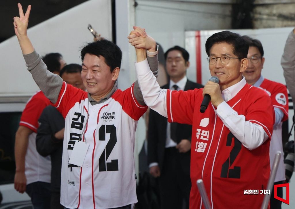 김문수 국민의힘 대통령 후보가 19일 서울역 광장에서 열린 "쏘울을 새롭게" 집중 유세에서 안철수 공동 선거대책위원자과 함께시민들에게 인사하고 있다. 2025.5.19 김현민 기자