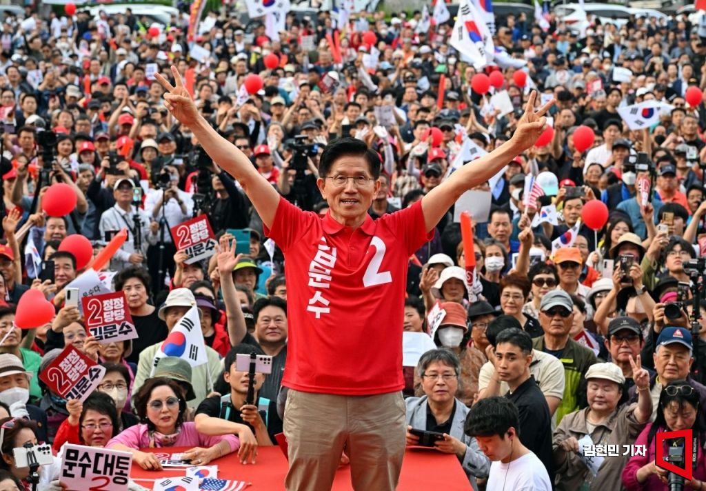 김문수 국민의힘 대선 후보가 지난 22일 경기 부천시 부천역마루광장에서 열린 집중유세에서 시민들에게 지지를 호소하고 있다. 김현민 기자