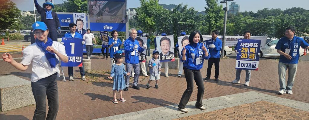 더불어민주당 광주선거대책위원장인 양부남 의원(서구을)과 선거운동원들이 25일 오후 광주 서구 풍암지구 롯데마트 월드컵점 앞에서 제21대 대통령선거 유세를 벌이고 있다. 현장에는 시민들과 어린이도 함께하며 율동과 구호를 나누는 등 사전투표를 독려하는 분위기가 이어졌다. 신동호 기자