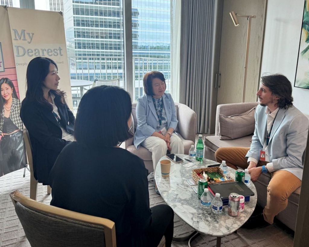 국내 방송 관계자들이 LA 스크리닝에서 해외 바이어와 콘텐츠 수출 계약을 논의하고 있다.