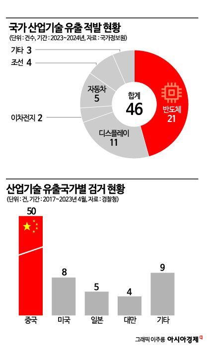 국가정보원의 '산업기술 해외유출 적발건수' 통계에 따르면 2023년부터 2024년까지 2년간 적발된 산업기술 유출은 총 46건이었다. 이 가운데 반도체가 21건으로 전체의 절반에 가까운 비중을 차지했고 디스플레이 11건, 자동차 5건, 조선 4건, 이차전지 2건 등이 뒤를 이었다. 반도체 기술이 가장 집중적으로 노출되고 있다는 점에서 이번 사건의 파장은 더욱 크다는 분석이 나온다.