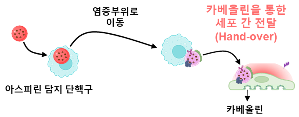 이후 단핵구는 세포외소포를 만들어 내부 아스피린을 주변 염증세포와 혈소판에 전달하는 '핸드오버' 메커니즘을 작동시킨다. 세포외소포는 세포 내 물질을 포장해 이웃세포에 전달하는 물체다. 이때 염증세포는 카베올린이라는 단백질은 발현해 아스피린을 받아들인다. 이번 연구에서는 염증이 심할수록 이 단백질이 늘어나 세포 간 약물 전달의 핵심 역할로서 작용한다는 사실을 영상으로 확인했다.