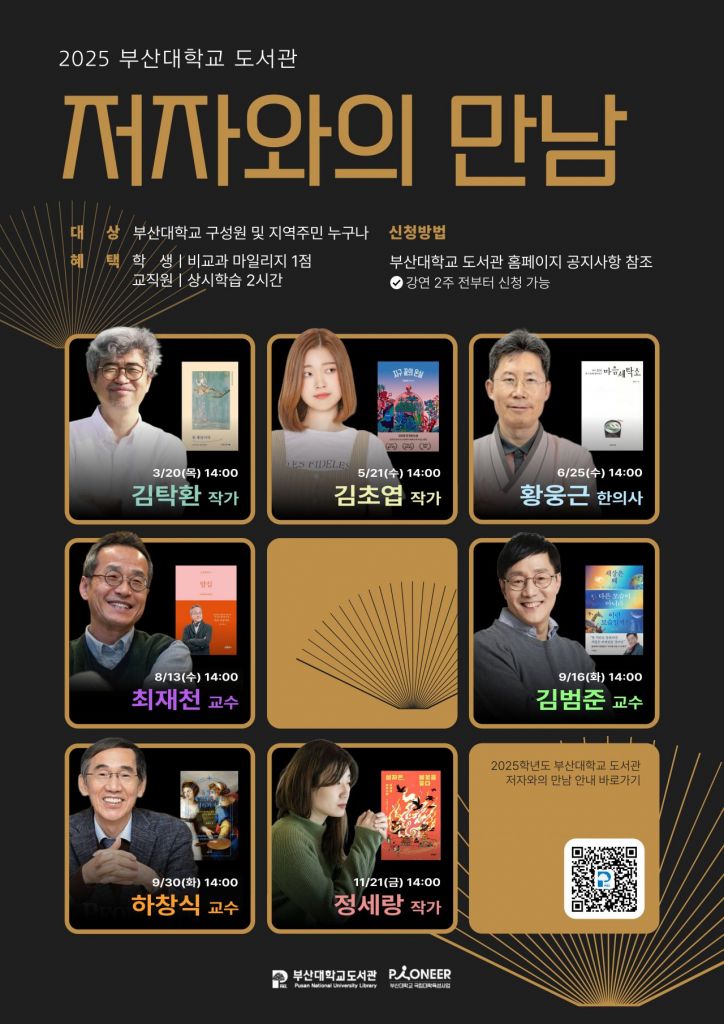 부산대 도서관은 올해 총 7회에 걸쳐 다양한 분야 저자들과의 만남을 마련하고 있다. 앞서 3월 김탁환 작가의 강연을 시작으로, 향후 △6월 25일 황웅근 한의사 △8월 13일 최재천 교수(이화여대) △9월 16일 김범준 교수(성균관대) △9월 30일 하창식 교수(부산대) △11월 21일 정세랑 작가 등의 강연이 예정돼 있다.