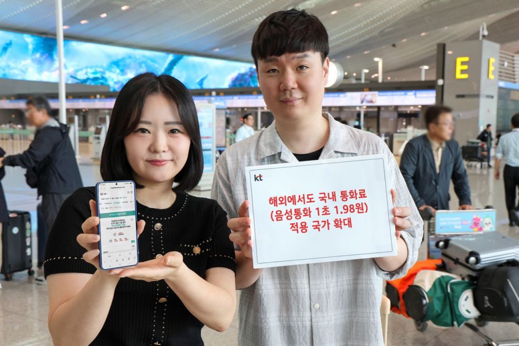 KT는 해외여행 성수기를 맞아 국내 통화료가 적용되는 '안심로밍' 서비스 국가를 기존 58개국에서 64개국으로 확대한다. 모델들이 인천국제공항에서 포즈를 취하고 있다. KT 제공