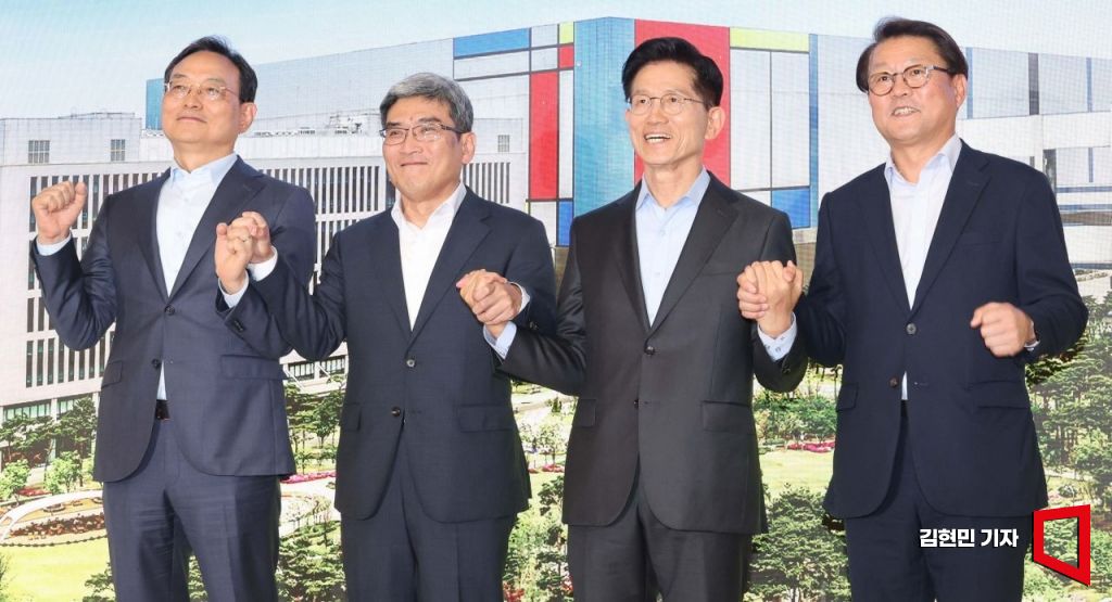 김문수 국민의힘 대선후보가 26일 경기 평택시 삼성전자 평택캠퍼스를 방문해 삼성전자 사장단과 기념촬영하고 있다. 왼쪽부터 김완표 삼성글로벌리서치 사장, 송재혁 삼성전자 DS부문 최고기술책임자(CTO) 사장, 김 후보, 박승희 삼성전자 CR담당 사장.