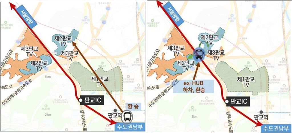 지금은 서울~판교를 잇는 광역버스 노선은 경부고속도로 판교 나들목(IC)으로 빠져나가 판교역 등에서 정차한다. 이곳에서 다시 시내버스로 갈아타 판교 2테크노밸리로 간다. 서울과 판교 2테크노밸리를 오가는 인원은 하루 평균 5000여명 정도라고 국토부는 설명했다.