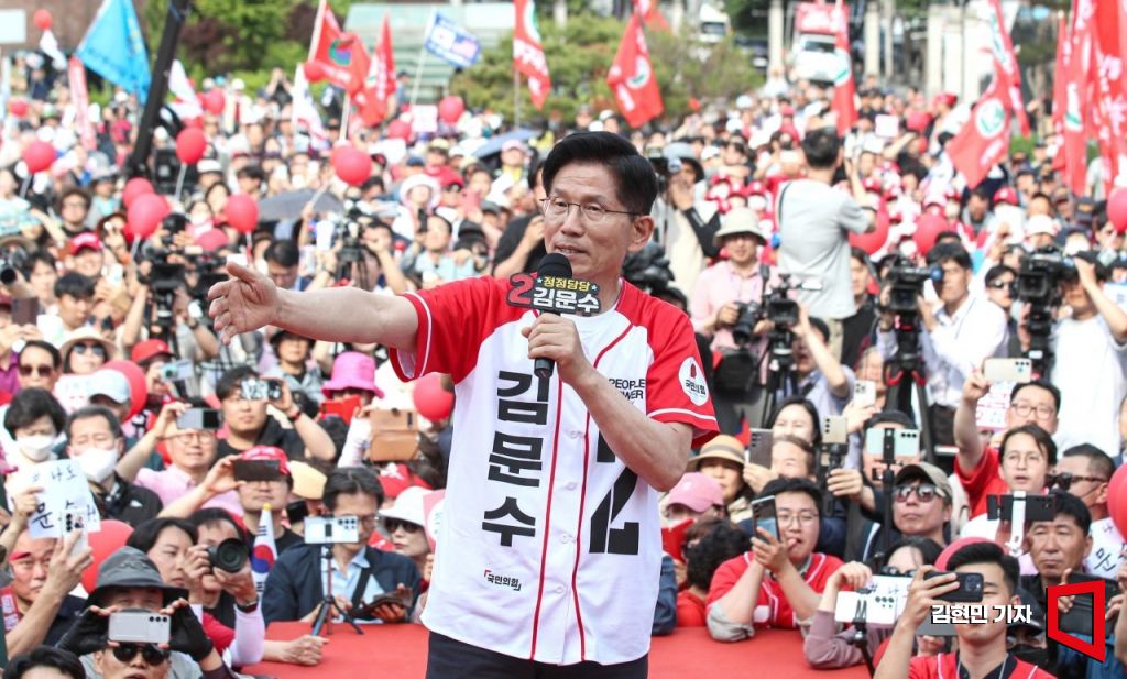 김문수 국민의힘 대선 후보가 26일 경기 용인시 수지구 포은아트갤러리 광장에서 유세를 하고 있다.