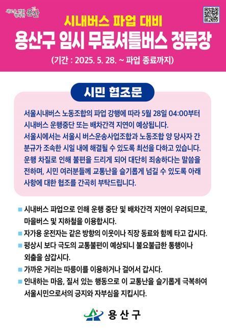 서울 용산구가 28일 서울 시내버스 전면 운행 중단에 대비해 임시 무료셔틀버스를 긴급 투입한다. 임시버스는 45인승 전세버스로 4개 권역에 각각 4대씩 총 16대가 투입된다. 운행 시간은 평일 오전 6시부터 밤 10시까지, 주말은 오전 7시부터 밤 9시까지이며, 배차 간격은 20~30분이다.