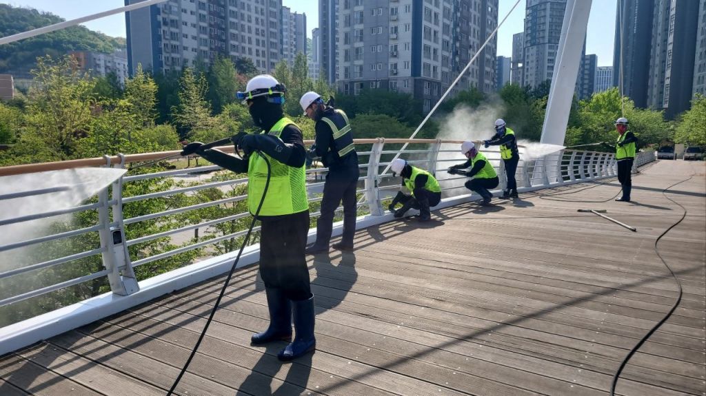 이번 정비는 꽃가루와 차량 매연 등으로 오염된 시설물을 정화, 강우 시 안전사고와 불편을 예방하기 위한 조치로 시행됐다.