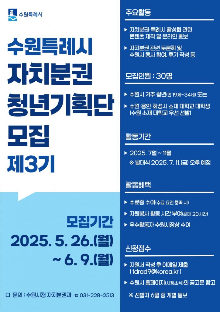 수원시는 수원에 거주하는 19~34세 청년과 수원·용인·화성시 소재 대학교 재학생을 대상으로 자치분권 청년기획단을 모집한다고 27일 밝혔다.