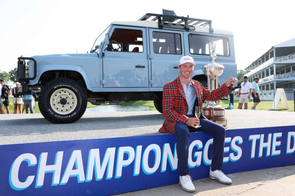 벤 그리핀이 찰스 슈와브 챌린지 우승 직후 트로피와 부상을 배경으로 포즈를 취하고 있다. 포트워스(미국)=AFP연합뉴스