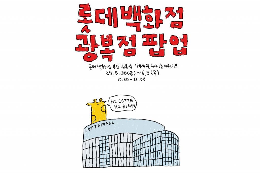 롯데백화점 광복점은 오는 30일부터 6월 5일까지, 감성 일러스트 브랜드 '왼그기그(왼손으로 그린 기린 그림)'와 영유아 전문 브랜드 '탑텐베이비'의 팝업스토어를 지하 1층에서 동시에 운영한다.