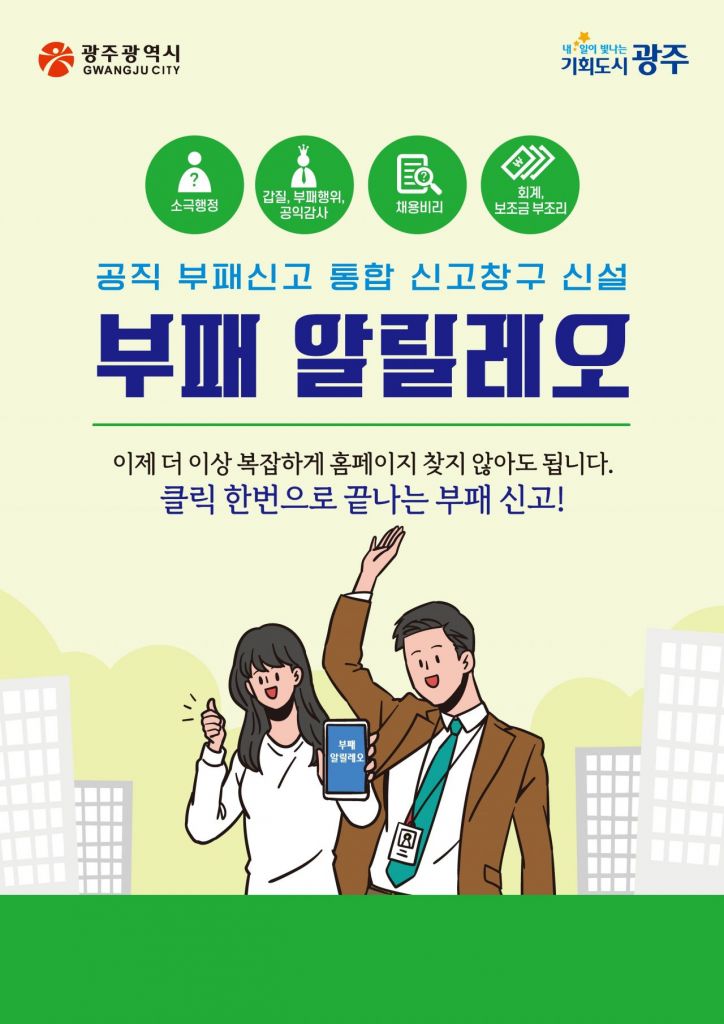 광주시는 공직사회 부패행위를 근절하고 시민의 신고 접근성을 높이기 위해 통합 신고시스템 '부패 알릴레오'를 구축하고, 6월 1일부터 본격 운영한다고 27일 밝혔다.