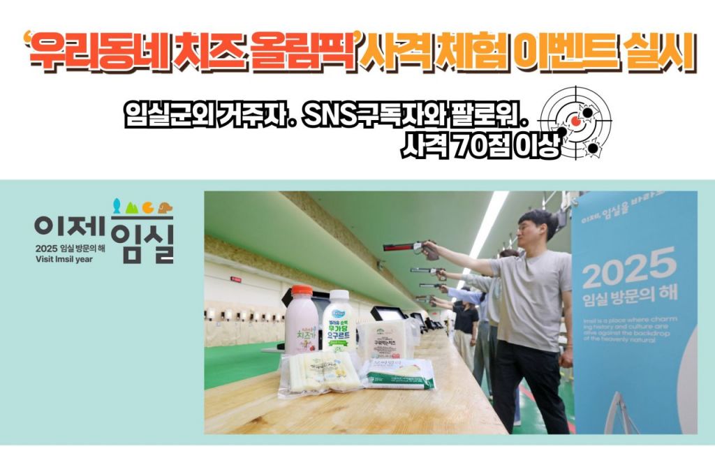 응모 방법은 사격장 내 비치된 배너 안의 QR 코드를 접속해 네이버 폼 양식에 성명, 주소, 연락처 기입 후 SNS 팔로우 인증샷과 사격점수 달성 점수판 인증 사진을 각각 1장씩 첨부하면 된다. 증정 선물은 3만원 상당의 임실 치즈·요거트 세트이며, 월 30명을 무작위 추첨해 기입된 주소지로 발송할 계획이다.