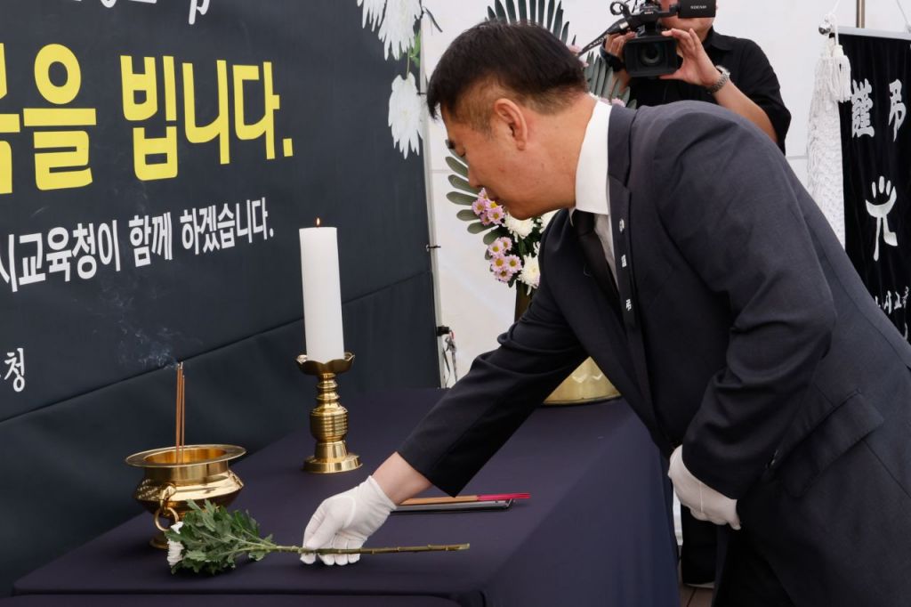 광주시교육청은 27일 본청 이음광장에서 제주 중학교 교사 추모식을 열었다. 이정선 교육감을 비롯한 간부 공무원들이 참석해 헌화와 묵념으로 고인을 애도했다. 이 교육감은 "한 아이를 위해 헌신한 선생님의 삶을 기억하며 고인의 명복을 빈다"며 "비극이 반복되지 않도록 교사가 존중받고 안전하게 교육할 수 있는 환경을 만들겠다"고 밝혔다. 교육청은 오는 30일 오후 8시까지 같은 장소에 시민 누구나 참여할 수 있는 추모 공간을 운영한다. 광주시교육청 제공