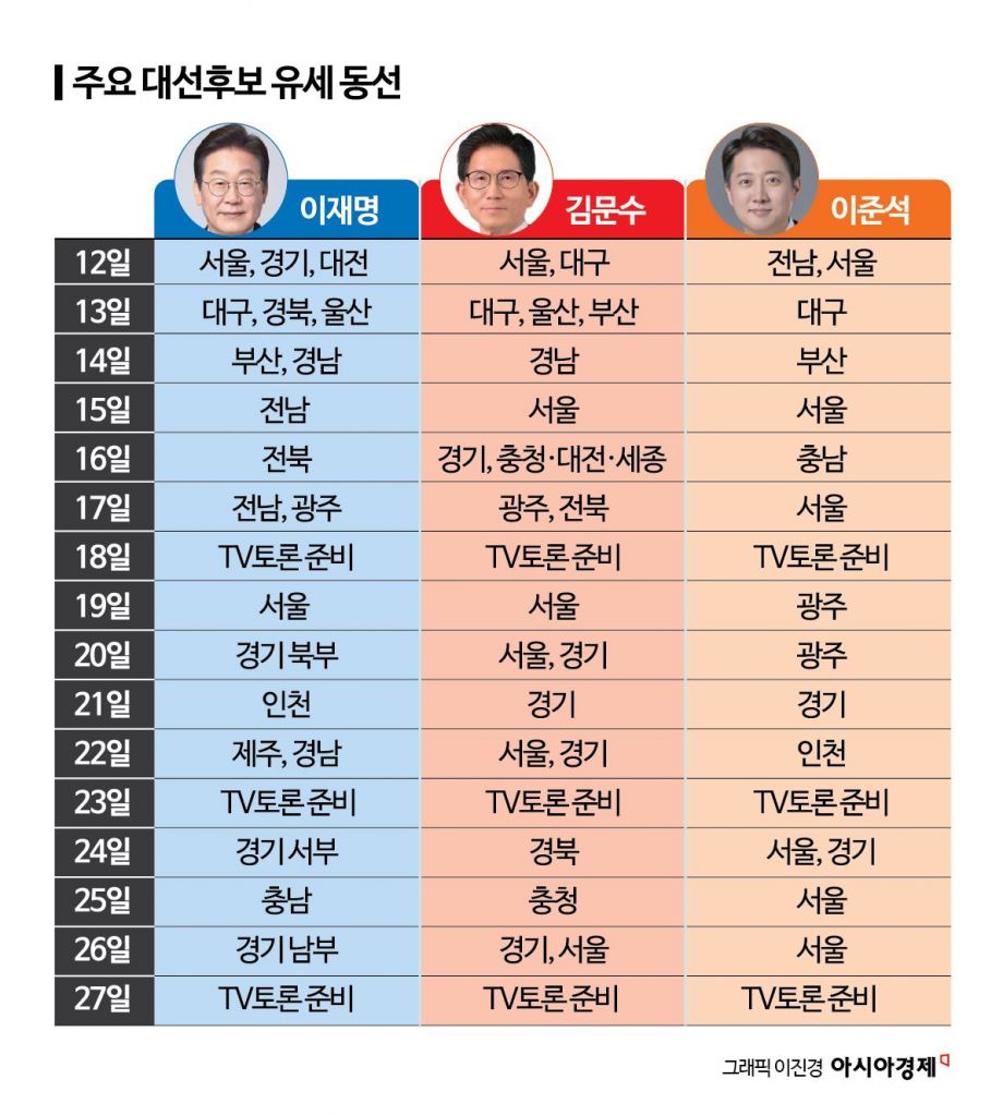 이 후보는 지금까지 호남 및 대구·경북(TK)과 수도권 거점 지역을 중심으로 동선을 최소화했다. 상대적으로 열악한 지역 조직을 고려한 '선택과 집중' 전략으로 최대 다수의 유권자와 접점을 늘리겠다는 구상이다.