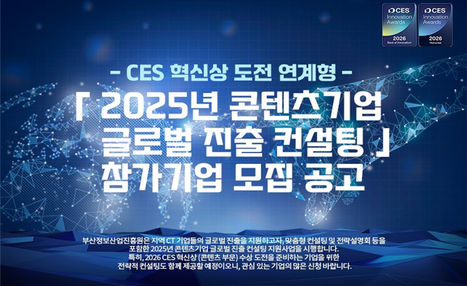 부산정보산업진흥원(원장 김태열)은 부산 콘텐츠 기업의 글로벌 시장 진출과 CES 혁신상 수상을 지원하는 맞춤형 컨설팅 사업인 '2025 콘텐츠기업 글로벌 진출 컨설팅'을 본격 추진한다.