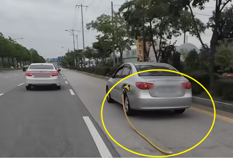 전의 한 도로에서 실수로 주유 건을 꽂은 채 주행하는 차량이 목격됐다. 27일 여러 온라인 커뮤니티와 사회관계망서비스(SNS)에는 노란색 주유 건을 꽂은 채 도로를 달리는 차량의 모습이 담긴 영상이 올라왔다. 온라인 커뮤니티 '보배드림'