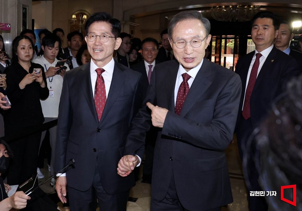 김문수 국민의힘 대선후보와 이명박 전 대통령이 27일 서울 여의도 켄싱턴호텔에서 오찬 회동을 하고 있다.