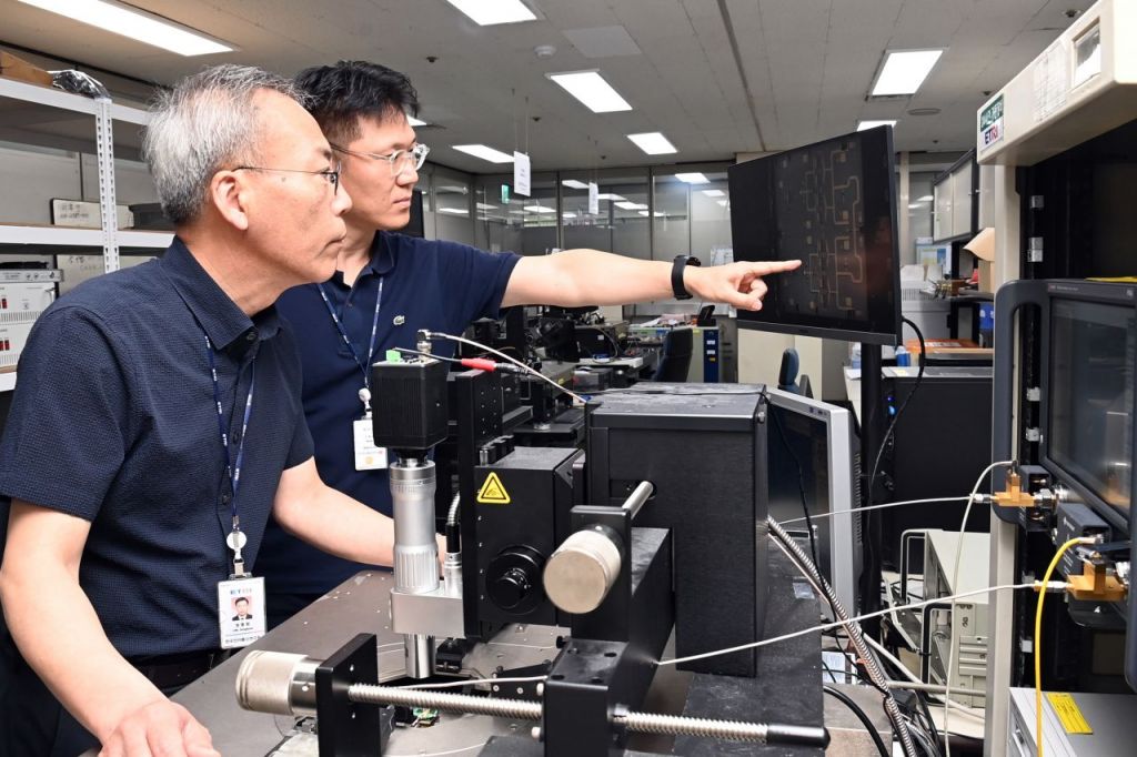 ETRI 연구진이 질화갈륨 MMIC의 회로 구조를 모니터로 확인·분석하고 있다. 한국전자통신연구원 제공