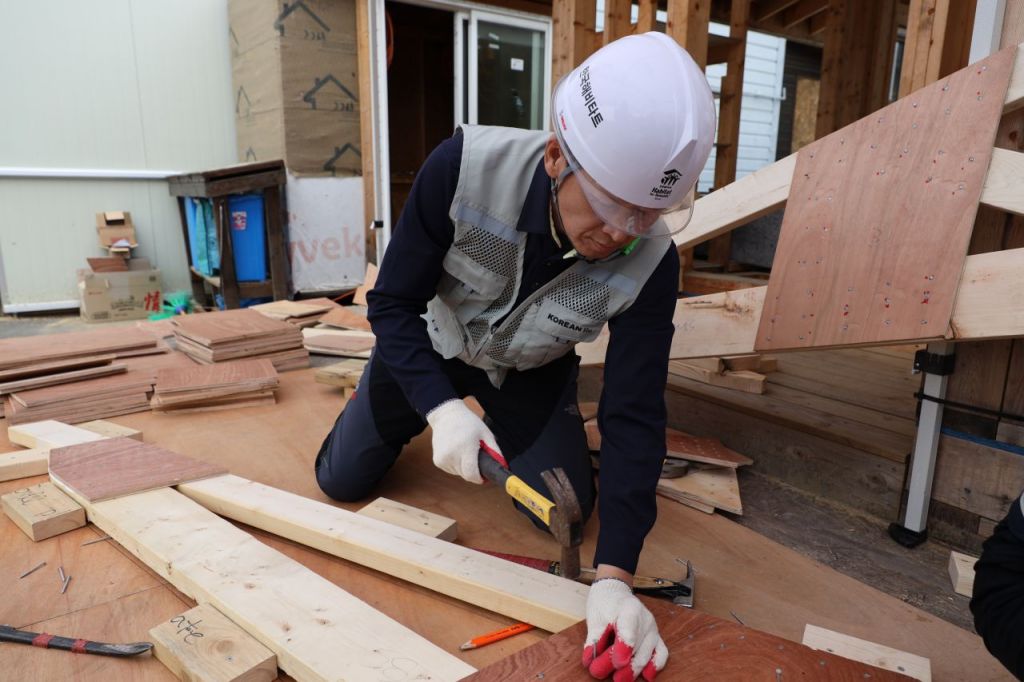 원종규 코리안리 사장이 지난 22일 천안 해비타트 빌더스 스쿨에서 집짓기 봉사활동에 참여하고 있다. 코리안리