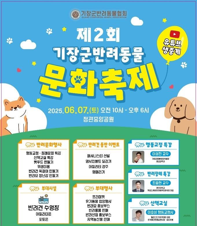 부산 기장군(군수 정종복)은 오는 6월 7일 정관 중앙공원 일대에서 '2025년 기장군 반려동물 문화축제'를 개최한다.