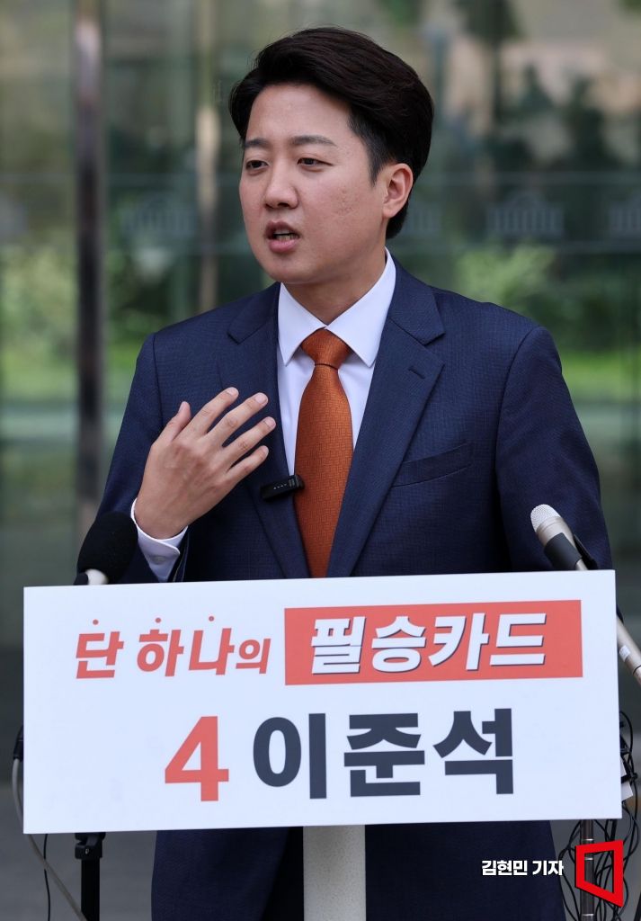 이준석 개혁신당 대선 후보가 27일 국회 소통관 앞에서 긴급 기자회견을 하고 있다.