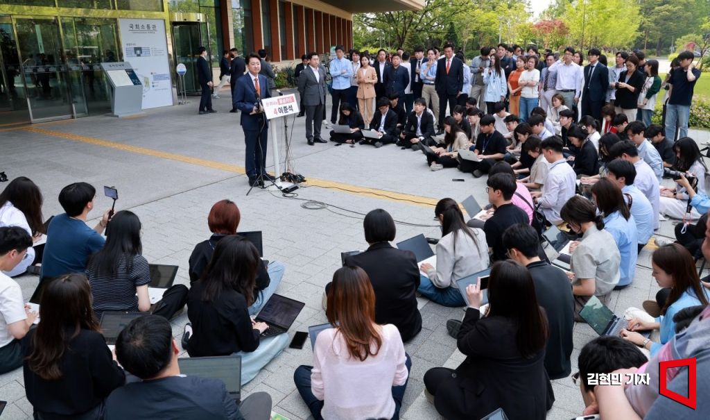 이준석 개혁신당 대선 후보가 27일 국회 소통관 앞에서 긴급 기자회견을 하고 있다.