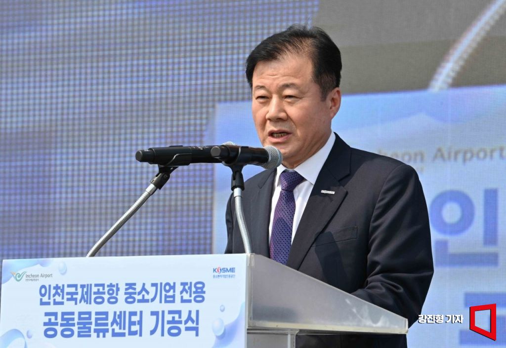 강석진 중소벤처기업진흥공단 이사장이 27일 오후 인천국제공항 제2공항물류단지 내 공동물류센터 현장에서 열린 중소기업전용 공동물류센터 건설사업 기공식에 참석해 축사를 하고 있다.
