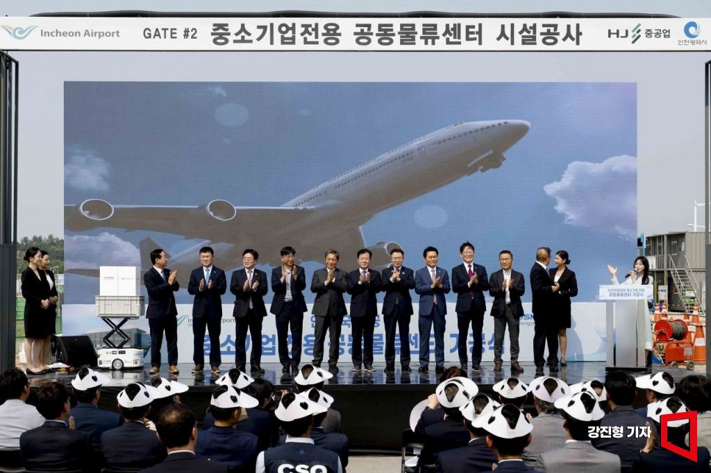 인천국제공항 중소기업전용 공동물류센터 기공식이 열린 27일 인천 중구 제2공항물류단지 내 건설현장에서 이학재 인천국제공항공사 사장과 강석진 중소벤처기업진흥공단 이사장 등 참석자들이 기념촬영을 하고 있다.