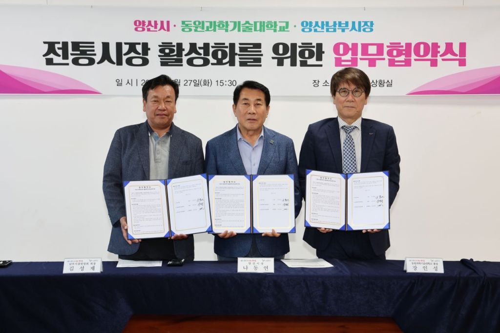 경남 양산시는 27일 오후 시청 본관 3층 상황실에서 동원과학기술대학교, 남부시장번영회와 함께 '전통시장 활성화를 위한 업무협약(MOU)'을 체결했다.