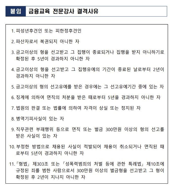 자격 조건은 연수 신청일 기준 금융 유관기관, 금융회사 또는 교사 경력을 합산해 5년 이상인 사람 중 금융교육 전문강사 결격 사유에 해당하지 않는 사람들이어야 한다. 연수 공고일로부터 최근 2년 이내에 양성연수에 참여한 적도 없어야 한다.