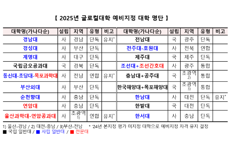교육부 발표 2025 글로컬대학 예비 지정 대학 명단.
