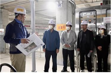 지난 7일 하남 유니온파크 내 ‘공공하수처리시설 증설사업’ 현장을 방문해 하수 유입·처리·방류의 주요 설비 설치 현황을 살펴보고 있는 최훈종 대표위원(오른쪽 두 번째)과 박선미 의원(가운데). 하남시의회 제공