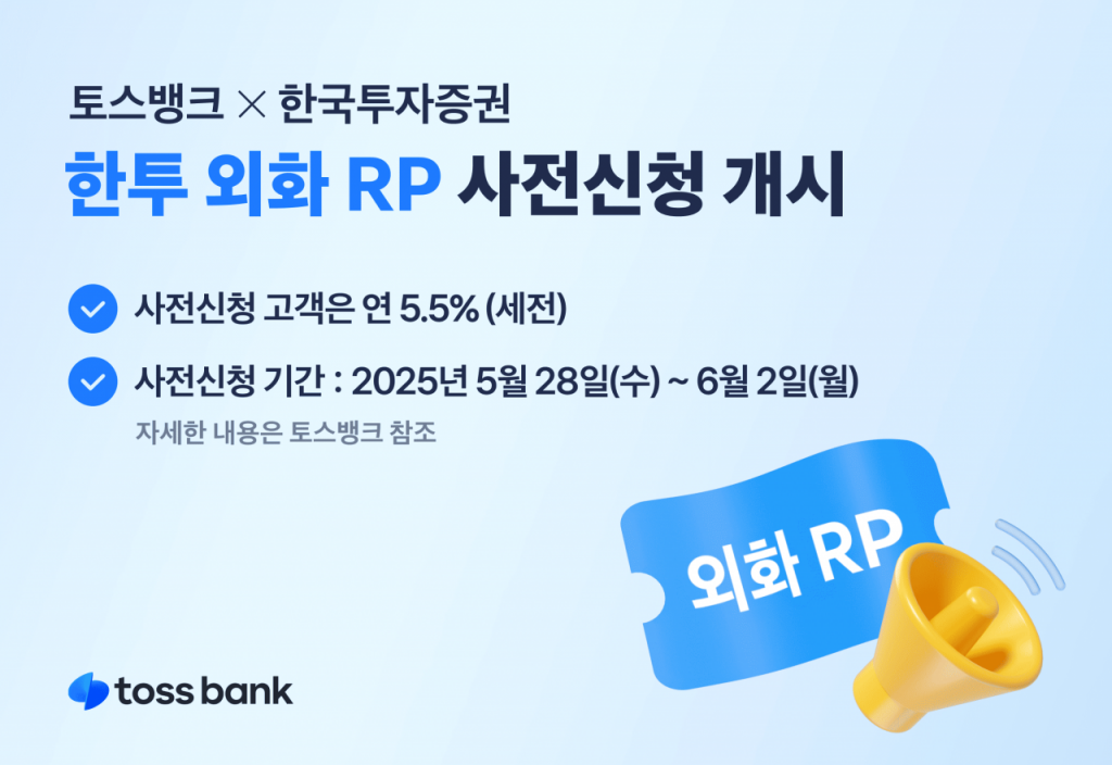 '한투 외화 RP'는 한국투자증권이 운용하는 31일 만기 외화 RP 상품으로, 사전신청 고객에게는 연 5.5%(세전)의 우대 금리가 제공된다. 일반 가입 시 기본 금리는 연 5.0%로, 사전신청만 해도 0.5%포인트 추가 금리 혜택을 받을 수 있다. 사전신청은 28일부터 6월2일까지 토스뱅크 앱에서 사전 신청 가능하며, 신청 고객에게는 정식 판매 개시 시 알림이 발송된다.