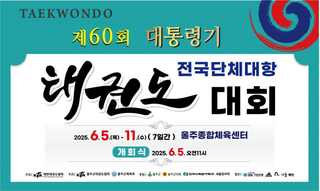 울산 울주군이 오는 7월 5일부터 11일까지 7일간 울주종합체육센터에서 '제60회 대통령기 전국단체대항 태권도대회'를 개최한다.