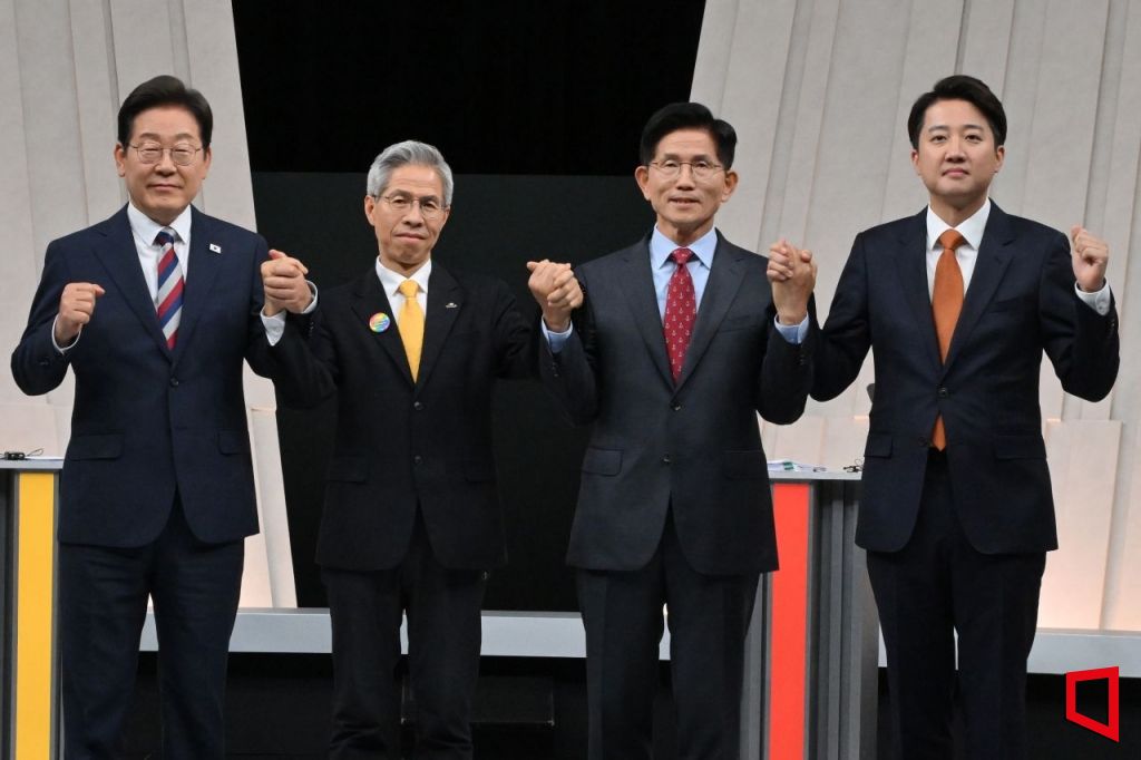 이재명 더불어민주당(왼쪽부터)·권영국 민주노동당·김문수 국민의힘·이준석 개혁신당 대선 후보가 27일 서울 마포구 상암동 MBC 스튜디오에서 진행된 정치 분야 TV토론회에 앞서 포즈를 취하고 있다. 2025.5.27 국회사진기자단